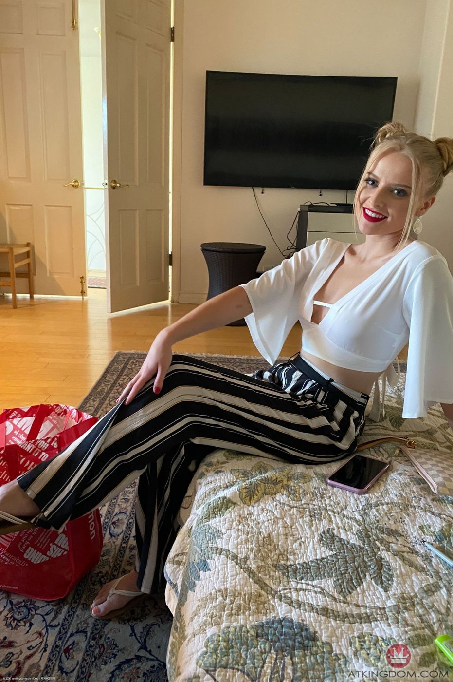 - Description: Paris White shows off her amazing body and spreads her ass and pussy. She takes you to the bathroom to release a nice golden stream for you. Brought to you by ATKINGDOM.